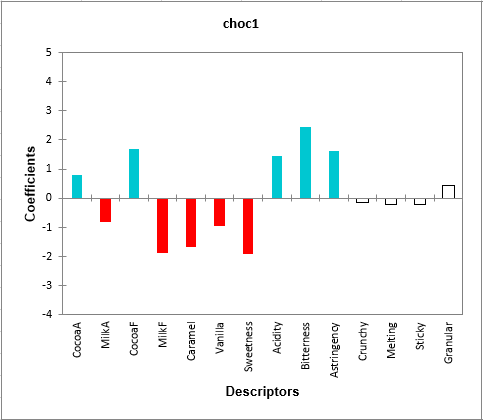 El siguiente gráfico resulta muy útil para definir nuestro producto (en este caso choc1). El color azul se asocia a los coeficientes que tienen un valor positivo significativo y el color rojo se asocia a los coeficientes que tienen un valor negativo significativo. Podemos ver que choc1 tiene un aspecto de cacao (cacao), es muy amargo y ácido. No es dulce y no sabe a leche.