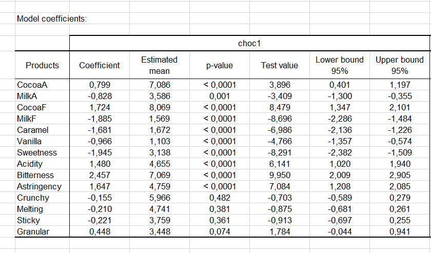 La siguiente tabla, que aparece parcialmente abajo (sólo para choc1), contiene los resultados más importantes del análisis de modelos de varianza (aquí hemos aplicado 16 análisis de modelos de la varianza). Se muestran los coeficientes de los modelos, las medias estimadas, los valores de las pruebas y los intervalos de confianza.