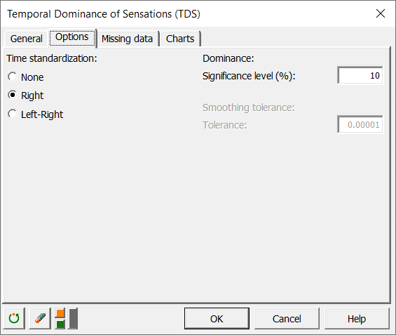 En la pestaña Opciones, seleccione el tipo de estandarización que desea aplicar. En nuestro caso, queremos aplicar una estandarización Derecha, lo que significa que los tiempos se desplazan de manera que todas las pruebas terminan en el mismo instante. Una estandarización a la derecha y a la izquierda significa que las marcas de tiempo sin un atributo dominante quedan eliminanadas. Además, puede seleccionar el nivel de significación se desea aplicar por encima del límite de casualidad. El límite de casualidad se define como la inversa del número de atributos.