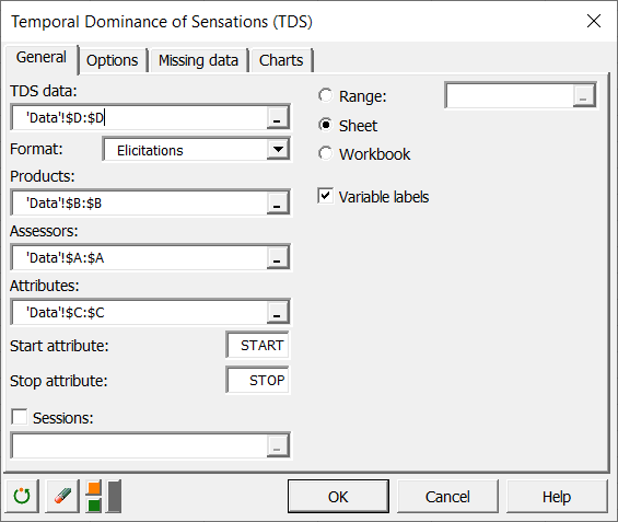 En la pestaña General, primero seleccione el formato elicitations. En el campo de Datos TDS, seleccione la columna de veces registradas. A continuación, seleccione las columnas que contienen la lista de los evaluadores, los productos y los atributos en los campos Jueces (Assessors), Productos (Products) y Atributos (Attributes) respectivamente. Por último, inserte los atributos de inicio y de parada tal como aparecen en la base de datos.