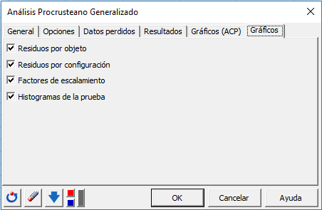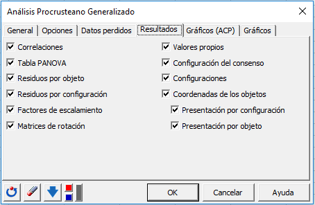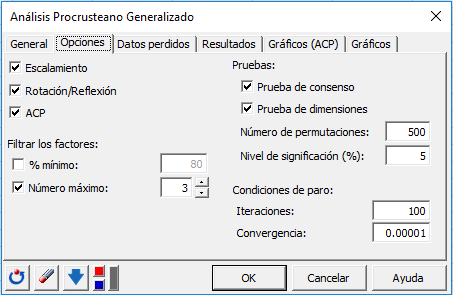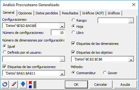 Para activar el cuadro de diálogo del GPA, elija el comando Análisis de datos sensoriales / Generalized Procrustes Analysis.