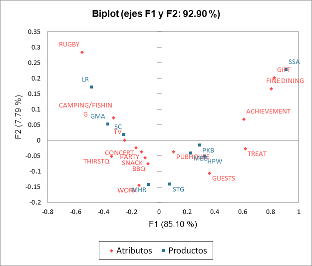 Uno de los resultados más importantes de CATATIS es la representación gráfica de productos y atributos. En el siguiente gráfico podemos ver por un lado que tenemos una inercia del 92,90% reportada por nuestros dos primeros ejes, por lo que podemos estar satisfechos con estos dos. El gráfico muestra un contraste entre los contextos que requieren celebración (gastronomía, logros ...) y los contextos casuales (pesca, rugby ...). Por lo tanto, la cerveza LR se ve más bien como una cerveza informal, mientras que la SSA se ve como una cerveza de celebración.