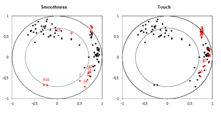 El gráfico que se muestra a continuación corresponde a la misma gráfica de correlaciones PCA replicadas para cada descriptor, destacando en rojo los 15 puntos de los pares (evaluador, descriptor) correspondientes al descriptor mencionado en el título. Esto permite comprobar en un solo paso el grado en que los evaluadores están o no de acuerdo para todos los descriptores, una vez que se elimina el efecto de la posición y la escala (debido a que el PCA se lleva a cabo sobre los datos estandarizados).