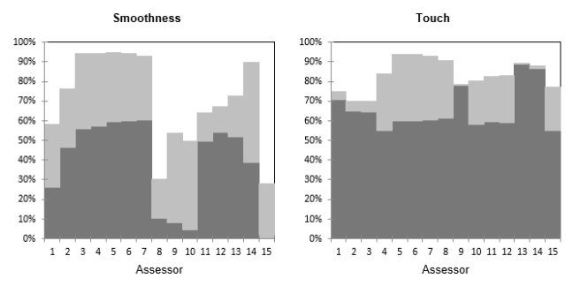 El siguiente gráfico muestra para cada par (evaluador, descriptor) el % de varianza explicado por el gráfico PCA. En gris oscuro se puede ver el % explicado por el primer eje y en gris claro el % de la varianza explicado por el segundo eje. Vemos que para la variable suavidad, hay diferentes grupos de evaluadores, con evaluadores (8, 9, 10) que están más relacionados con el segundo eje, pero aún así mal representados. También podemos confirmar que las variables elasticidad y cierre están próximas y son explicadas por el segundo eje.