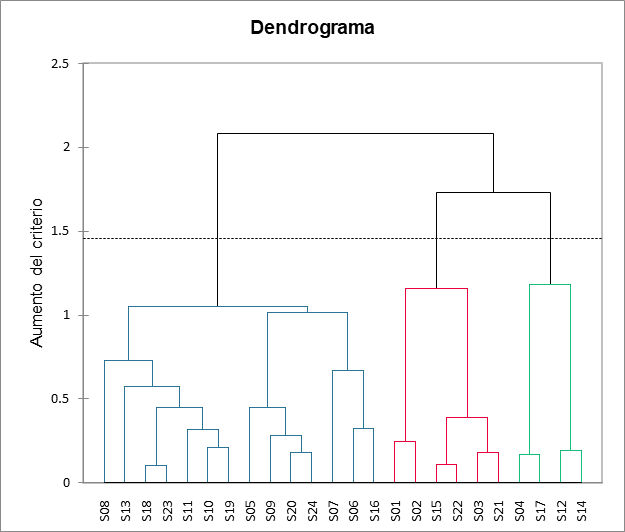 El siguiente gráfico es un dendrograma. Representa cómo funciona el algoritmo para agrupar las configuraciones, luego los grupos de configuraciones. Como puede ver, el algoritmo ha agrupado con éxito todas las configuraciones. La línea de puntos representa el truncamiento automático, lo que lleva a tres grupos.