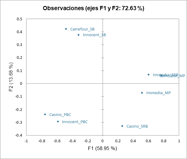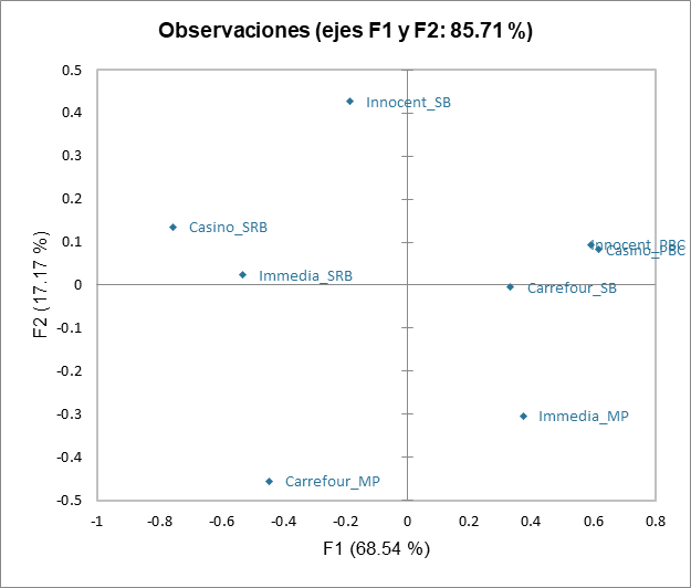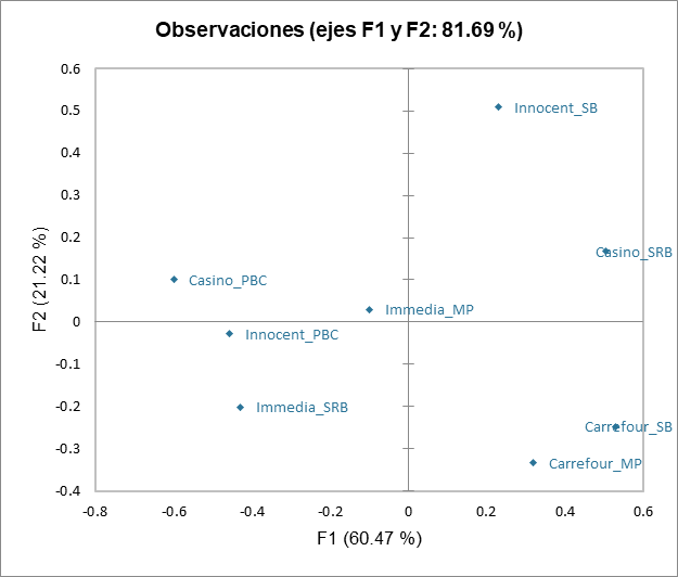 Luego viene el análisis de cada una de las clases construidas. La representación de los objetos (batidos aquí) en cada clase muestra diferencias en la percepción entre las clases de sujetos, especialmente en lo que respecta al batido Carrefour_SB. De hecho, este último es colocado con el batido Innocent_SB por los sujetos de la clase 1, con Innocent_PBC y Casino_PBC por los sujetos de la clase 2, y con Carrefour_MP por los de la clase 3.