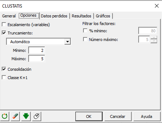 En la pestaña Opciones, optamos por no reducir las variables, ya que dentro de cada configuración, todas las variables están en la misma escala. Decidimos dejar automática la elección del número de clases y aplicar una consolidación de las clases obtenidas por el algoritmo jerárquico para obtener un análisis de conglomerados más preciso.
