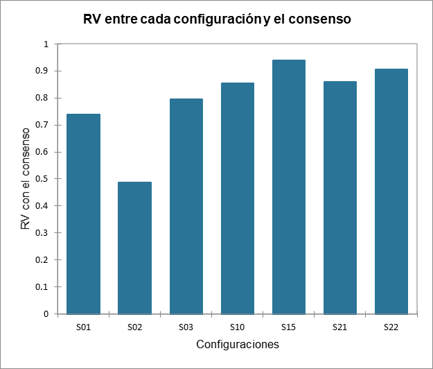 El siguiente gráfico da indicaciones sobre la proximidad de las configuraciones y el consenso de la clase en la que están ubicadas. Estas proximidades están representadas por el coeficiente RV, que es un índice de similitud entre 0 y 1. En la clase 2, podemos observar que el sujeto 2 está mucho más alejado del consenso que los demás, lo que significa que no se ajusta bien a la clase. Su percepción es diferente a todas las clases (ya que ha sido colocado en la clase que más le corresponde por el algoritmo). Este tipo de problema se puede resolver agregando la clase "K + 1" en la pestaña Opciones, que es una clase adicional diseñada para dejar de lado configuraciones atípicas.