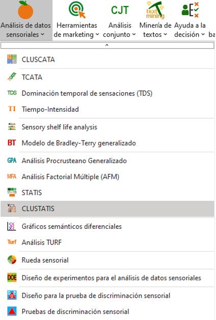 Seleccione el comando XLSTAT/Funciones avanzadas/Análisis de datos sensoriales/ CLUSTATIS (ver más abajo).