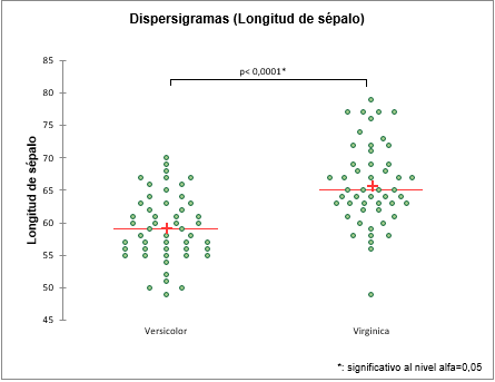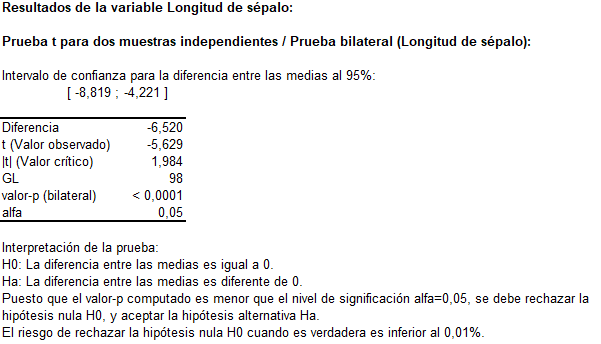 Los datos son de [Fisher M. (1936), The Use of Multiple Measurements in Taxonomic Problems. Annals of Eugenics, 7, 179 -188], y corresponden a 100 flores Iris, definidas por cuatro variables (longitud del sépalo, anchura del sépalo, longitud del pétalo, anchura del pétalo) y sus especies. El conjunto de datos original contiene 150 flores y 3 especies, pero hemos aislado para este tutorial las observaciones que pertenecen a las especies Versicolor y Virginica. Nuestro objetivo es poner a prueba si existe una clara diferencia entre las dos especies en las cuatro variables evaluadas.