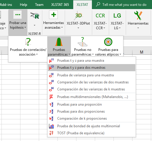 Una vez abierto XLSTAT, seleccione el comando XLSTAT / Pruebas paramétricas / Pruebas t y z para dos muestras, o bien haga clic en el botón correspondiente de la barra de herramientas Pruebas paramétricas (véase siguiente captura de pantalla).