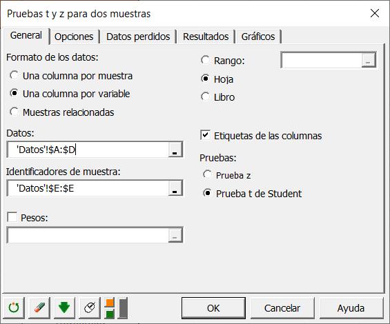 Datos para ejecutar la prueba t de Student para dos muestras independientes