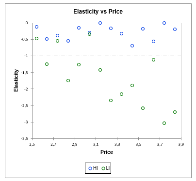 We can see that the price elasticity is most of the time lower for the low-income group than for the high-income group. We can also see that for the low-income group, the higher the price the lower the elasticity, while for the high-income group, the elasticity is always in the same range.