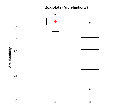 To compare the elasticities of the two groups, we then run a t-test with an automatic F-test to verify if the variance is homogeneous across groups. From the outputs of the t-test we extracted the box plots which confirms a significant difference in mean and variance.