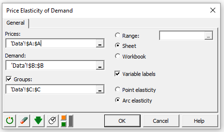 In the General tab, select columns A, B and C in the Prices, Demand and Groups fields. Here, we choose to compute the arc elasticities.