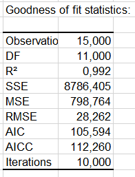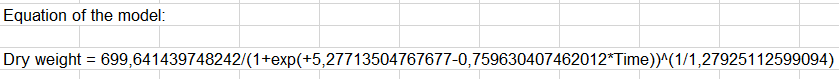 The first table gives basic statistics for the dependent and explanatory variables. The second table (see below) displays the goodness of fit coefficients, including the R² (coefficient of determination), and the SSE (sum of square of errors), the latter being the criterion used for the model optimization. The R² indicates the % of the variability of the dependent variable (the dry weight) explained by the explanatory variable (the time). The closer to 1 the R² is, the better the fit.
