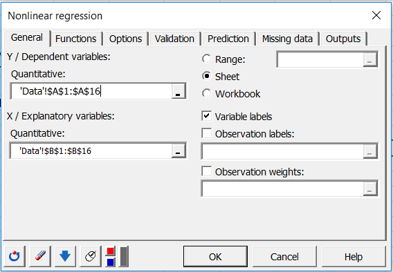 The nonlinear regression dialog box pops up. Select the data on the Excel sheet.