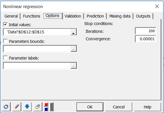 In the Options tab, we select the starting points that corresponds to the initial value of each parameter. Note: a header must not be selected here.