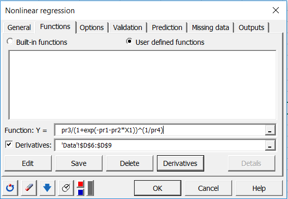 XLSTAT syntax: 1/(1+exp(-pr1-pr2*X1))^(1/pr4)