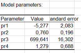 The next table shows the detailed results for the model parameters. Parameter pr3, which initial value vas 725, is equal to 699.64 after the fitting. The standard deviation gives an idea of the reliability of result obtained for each parameter. The value of the parameter pr4 being close 1, one can imagine that a 3 parameters logistic regression would give an almost as good result, a hypothesis that you can easily test as this function is available in the preprogrammed functions list.