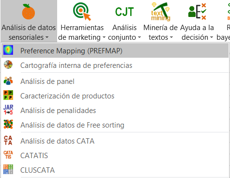 Para activar el cuadro de diálogo del Preference Mapping, inicie XLSTAT, luego elija el comando XLSTAT/Análisis de datos sensoriales/Preference Mapping, o haga clic en el botón equivalente de la barra de herramientas "Análisis de datos sensoriales" (ver a continuación).
