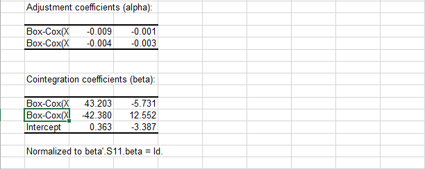 A continuación se muestran los resultados de ambas pruebas, la prueba max eigen (o prueba de lambda) y la prueba trace (véase más adelante). Ambas pruebas concuerdan en el rango(1) de cointegración del sistema o, lo que es equivalente, en la existencia de 1 relación de cointegración entre las dos series. Se estiman los valores p y los valores crÃticos para ambas pruebas utilizando el método de regresión de superficie descrita en MacKinnon-Haug-Mechelis (1998).