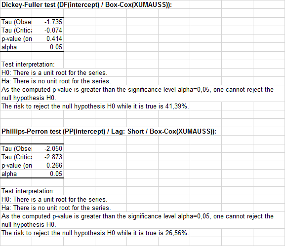 Una vez haya hecho clic en OK, las pruebas se realizan y se muestran los resultados de las dos series. Para la serie Box-Cox(XUMADSY), ni la prueba DF, ni la prueba PP rechazan la hipótesis nula de una presencia de una raÃz unitaria en el proceso de generación de datos (véase siguiente captura de pantalla).