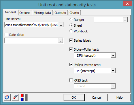 En el campo Series temporales, seleccione las dos series transformadas, Box-Cox(XUMADSY) y Box-Cox(XUMAUSS), y active la pruebas de Phillips-Perron y Dickey-Fuller como se muestra a continuación.