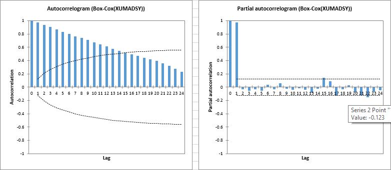 En primer lugar, como se muestra a continuación, la ACF de la serie Box-Cox(XUMADSY) exhibe un gran número de retardos significativos.