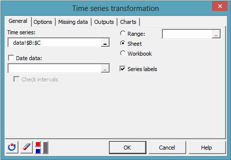 Aparece el cuadro de diálogo de Transformación de series de tiempo como se muestra a continuación. Seleccione la serie de tiempo en la hoja de cálculo de Excel.