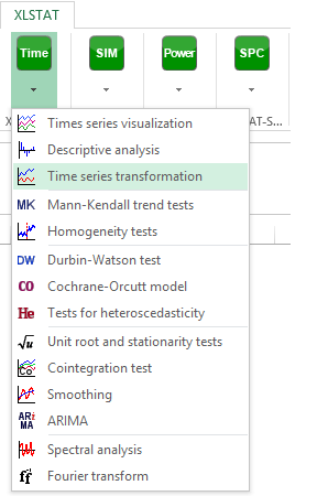 En primer lugar, tenemos que transformar la serie extraÃda de la base de datos del Banco de Inglaterra para obtener sus valores log. Una vez abierto XLSTAT, seleccione el comando Análisis de series temporales / Transformación de series de tiempo (véase siguiente captura de pantalla).
