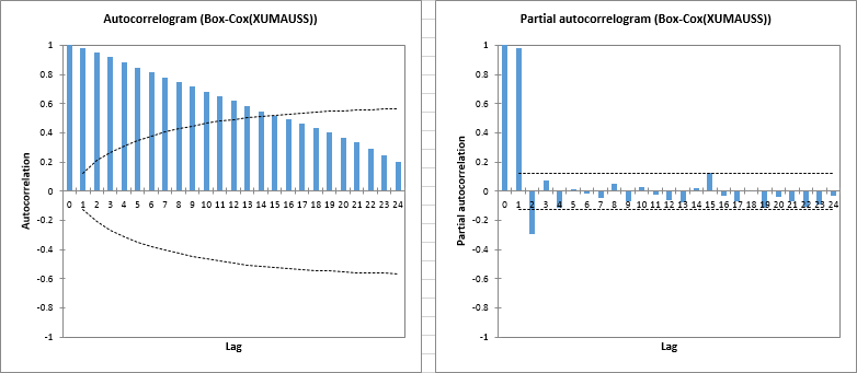 La situación es muy similar para la segunda serie de tiempo llamada Box-Cox(XUMAUSS) como se muestra a continuación con un retardo-1 fuertemente significativo en la PACF.