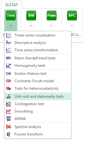 Seleccione Análisis de series temporales / Pruebas de raÃz unitaria y de estacionariedad, como se muestra a continuación.