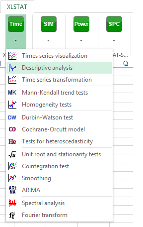 Para llevar a cabo un análisis descriptivo, haga clic en el comando Análisis de series temporales / Análisis descriptivo, como se muestra a continuación.