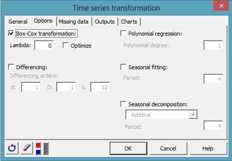En la pestaña Opciones, seleccione la Transformación Box-Cox y fije el valor de Lambda de 0 para aplicar una transformación logarÃtmica a la serie:
