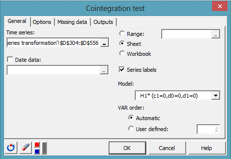 Aparece el cuadro de diálogo de prueba de cointegración como se muestra a continuación. En primer lugar, seleccione las dos series de tiempo transformadas, Box-Cox(XUMADSY) y Box-Cox(XUMAUSS). Seguidamente, debemos seleccionar un modelo para la prueba.
