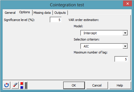En la pestaña Opciones, hay que seleccionar un modelo y un criterio para la estimación del orden VAR. Una vez más parece apropiado un modelo con intercepta, y vamos a utilizar el criterio AIC: