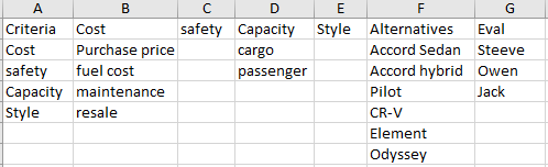 The data correspond to the parameters of a decision problem about the purchase of a new car. We have 3 evaluators named Steeve, Owen, and Jack who participate in the decision making. The criteria are the cost, safety, capacity and style of the car. The criterion cost is divided into subcriteria which are the purchase price, the fuel cost, the maintenance, and resale. The criterion capacity includes 2 subcriteria which are the number of passengers and the capacity of cargo. Six car models are evaluated using all criteria and subcriteria. The solutions to the problem are called alternatives. The data is grouped in a table as follows: