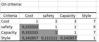 For example, Owen has evaluated the cost versus the style at 7. According to the Saaty scale, this means that the cost is judged to be very important compared to the style criterion.