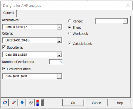 After clicking the OK button, the design of the experiment is generated and displayed in a new sheet named AHP design. The data summary table, the Saaty table and the instructions for filling in the comparison tables of the design are displayed in the output sheet.