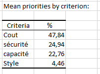 In this example, it is the cost criterion that impacts the most the decision making, and in particular the subcriterion purchase price.