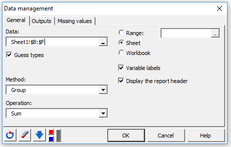 Select columns B-F from Sheet1 in the field Data. Then select the method Group and the operation Sum. Headers are also included in our data selection, so we check the Variable labels.
