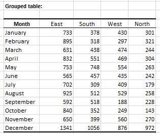 XLSTAT generates the grouped table below including the total sales amount per month for each of the locations.