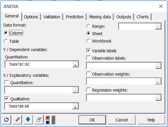 En XLSTAT, es posible seleccionar los datos de dos maneras diferentes para el ANOVA. La primera se presenta en forma de columnas, una columna para la variable dependiente y otra para la variable explicativa.