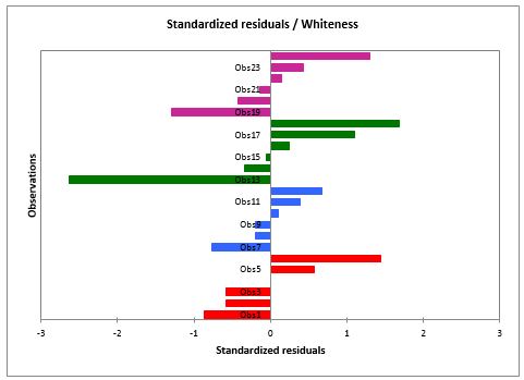 El cuadro siguiente expone el análisis de los residuos. Los residuos centrados reducidos deben tener una atención particular, dado que las hipótesis vinculadas al ANOVA, deben ser distribuidos según una ley normal N(0,1). Eso significa que el 95% de los residuos deben encontrarse en el intervalo [-1.96, 1.96]. Dado que el escaso número de datos del que disponemos aquà Â, cualquier valor fuera de este intervalo es revelador de un dato sospechoso. Podemos identificar aquà  un valor sospechoso (decimotercera observación) el residuo siendo igual a -2.8279. Con el fin de explicar este valor, podremos verificar que el dentà Âfrico bueno fue entregado efectivamente a esa persona, o analizar la razón por la cual la reacción del paciente al dentà Âfrico fue más escasa que para otros.