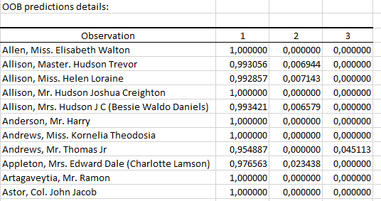 The next table contains for each observation the probability to belong to the different category of the response variable (based on the Out-Of-Bag data).