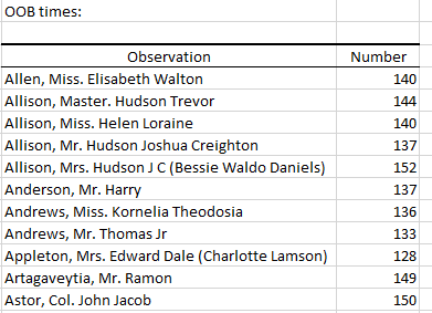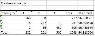 The next table displays the confusion matrix. That matrix tells us how well our classifier performed (predictions based on Out-Of-Bag data). Here, the algorithm predicted correctly 94.92% of observed classes.  The second table displays the predicted class for each observation of the training set when the latter is Out-Of-Bag.Â