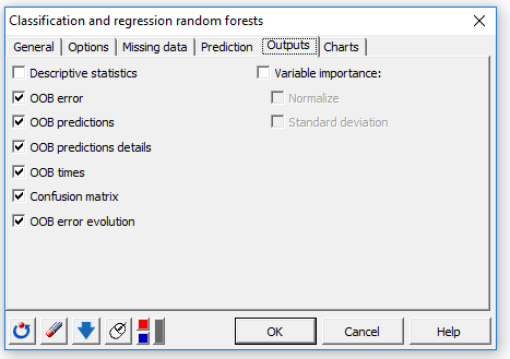 In the Outputs tab, select the below outputs: In the Charts tab, activate the OOB error evolution option to display the OOB (Out Of Bag) error evolution according to the number of trees built. The computations begin once you have clicked on OK.