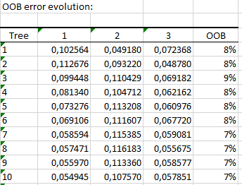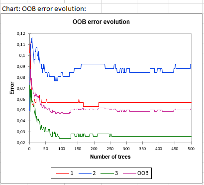 The number of times observations are ‘out-of-bag’ (and thus used in computing OOB error estimate) is also displayed: The last table presents the evolution of the OOB error rates according to the number of trees. The i-th element being the OOB error for all trees up to the i-th. A graphical representation of the above table is given below: