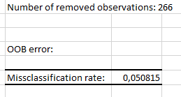 The first output is the OOB error rate of the random forest. It corresponds to the average classification error committed on each OOB sample of the training set. We call OOB sample, the sample made up of all the Out-Of-Bag observations. More details are available in the Help menu.